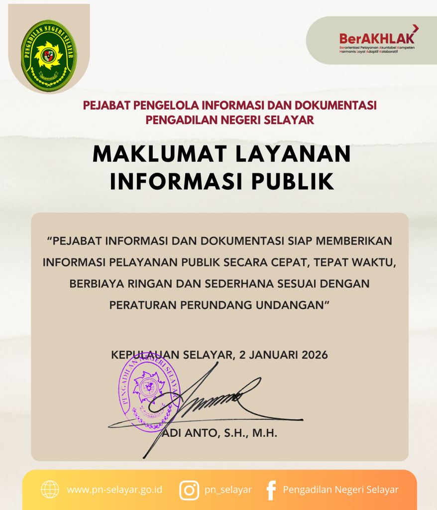 Ketua Mahkamah Agung RI pada tanggal 5 Januari 2011 telah menerbitkan Surat Keputusan Ketua Mahkamah Agung RI Nomor 1-144/KMA/SK/I/2011 tentang Pedoman Pelayanan Informasi di Pengadilan